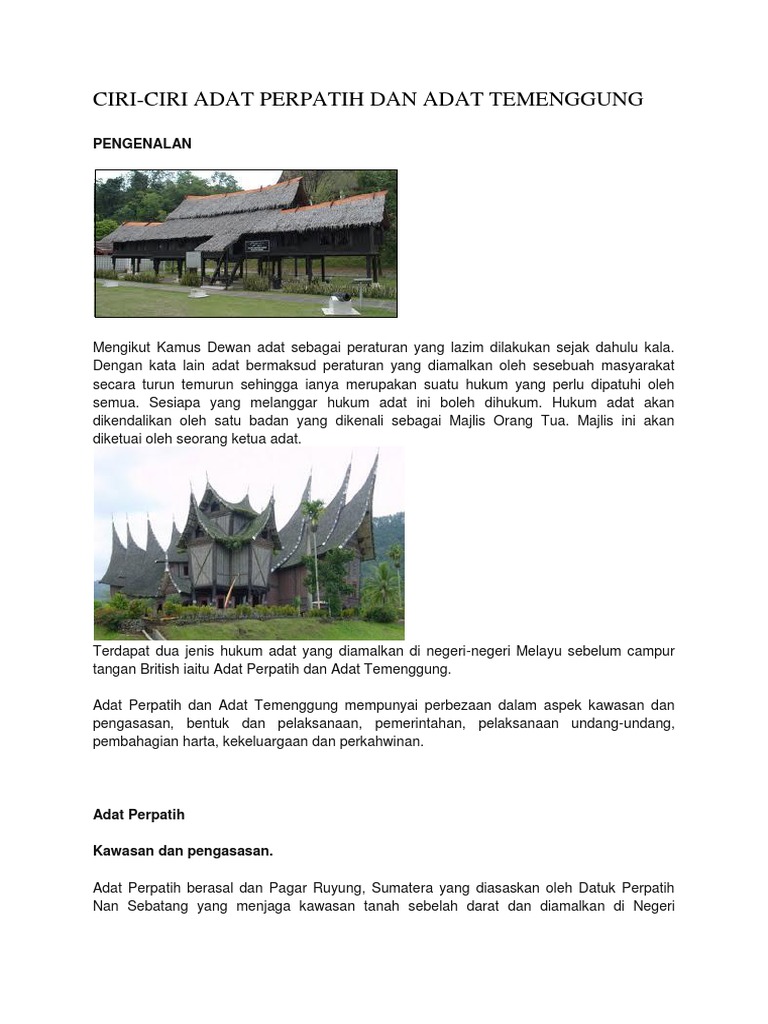 Dalam pado tu dimintaklah yang pandai adat dan yang bogola pusako adat dan yang monjadi pongama adat tu bori maksud tosirat e bia torang lai bosuloh yang kolam nampak joleh yang kusam nampak putih yang jaoh somakin dokek yang dokek somakin togap. Adat temenggung adat temenggung is minangkabau customary law which practiced in all malay states except negeri sembilan which practiced adat perpatih. Pemilihan ketua dilantik oleh kumpulan ketua daripada peringkat bawah. Adat perpatih dan temenggong keduanya berasal dar minangkabau. Adat temenggung is favourable to men compared to adat perpatih.