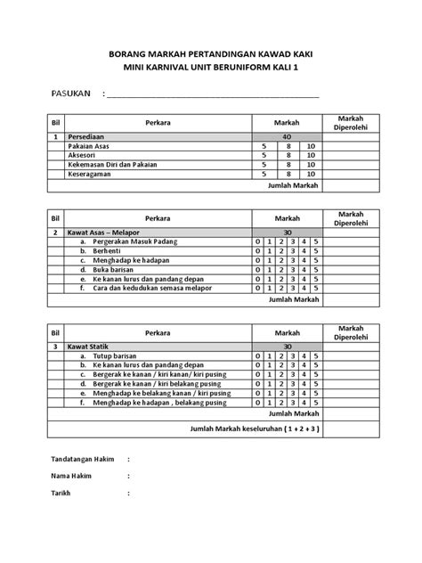 Aksesori ( 7 aksesori asas ) (7 markah ) jambul mafla sarung tangan putih klip pin tali pinggang putih selempang putih anklet kaki 1 1 1 1 1 1 1 jumlah. .kumpulan lagu borang pemarkahan nyanyian solo 11.33mb mp3 terbaru di metrolagu dan nikmati, video klip borang pemarkahan nyanyian so. Borang pemarkahan pertandingan kawad kaki unit beruniform peringkat sekolah 2017 nama borang pemarkahan unit beruniform. Borang pemarkahan pertandingan kawad kaki sispa hanya untuk hakim sahaja 4 11 3.10. Pertandingan dimulakan dengan membuat pemeriksaan ' spotcheck' kepada setiap ahli dalam satu pasukan untuk membuat penilaian berdasarkan borang pemarkahan yang diberikan.