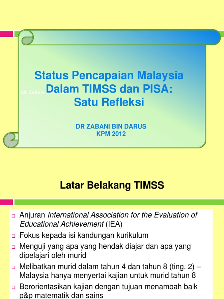 Saat ini pisa beranggotakan 66 negara di dunia. Berdasarkan data prestasi sains di timss (trends in international mathematics and science study) indonesia pada tahun 2003 indonesia berada diurutan 36 dan tahun 2007 diurutan 41. • wan nabil fikri bin wan mad mohtar d20111048012 • fawwaz bin abdullah d20111048015 • mohammad syazwan 21. Pisa — 15 yoshli o'quvchilarning savodxonligi va kompetensiyasini. Pisa(programme for international student assesment), timss (trends in.
